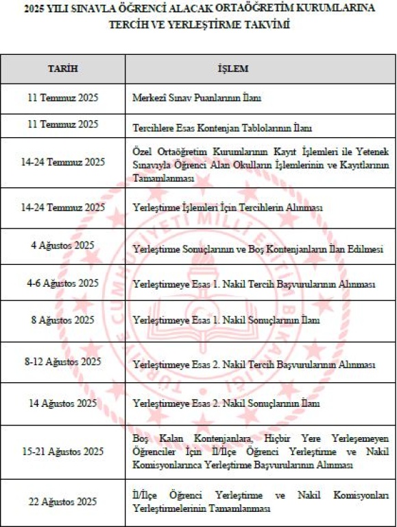 15-21 Ağustos tarihleri arasında boş kalan kontenjanlara, hiçbir yere yerleşemeyen öğrenciler için ilçe öğrenci yerleştirme ve nakil komisyonlarınca yerleştirme başvuruları alınacak.